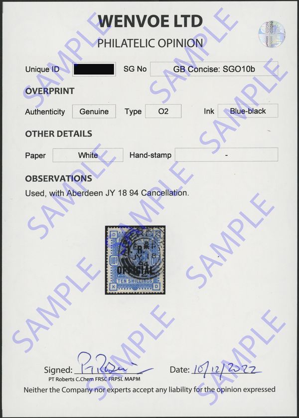 Wenvoe Ltd provides specialist services for the certification of Great Britain Departmental and Specimen/Cancelled overprints. A full colour certificate is provided for each item submitted (unless an advice note is specifically requested - usually for forgeries or low value items).